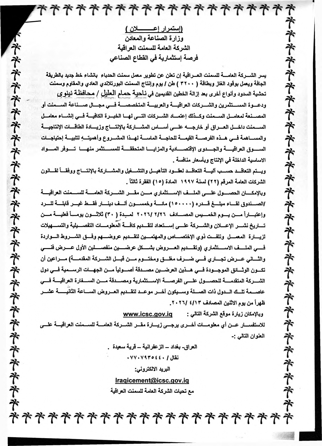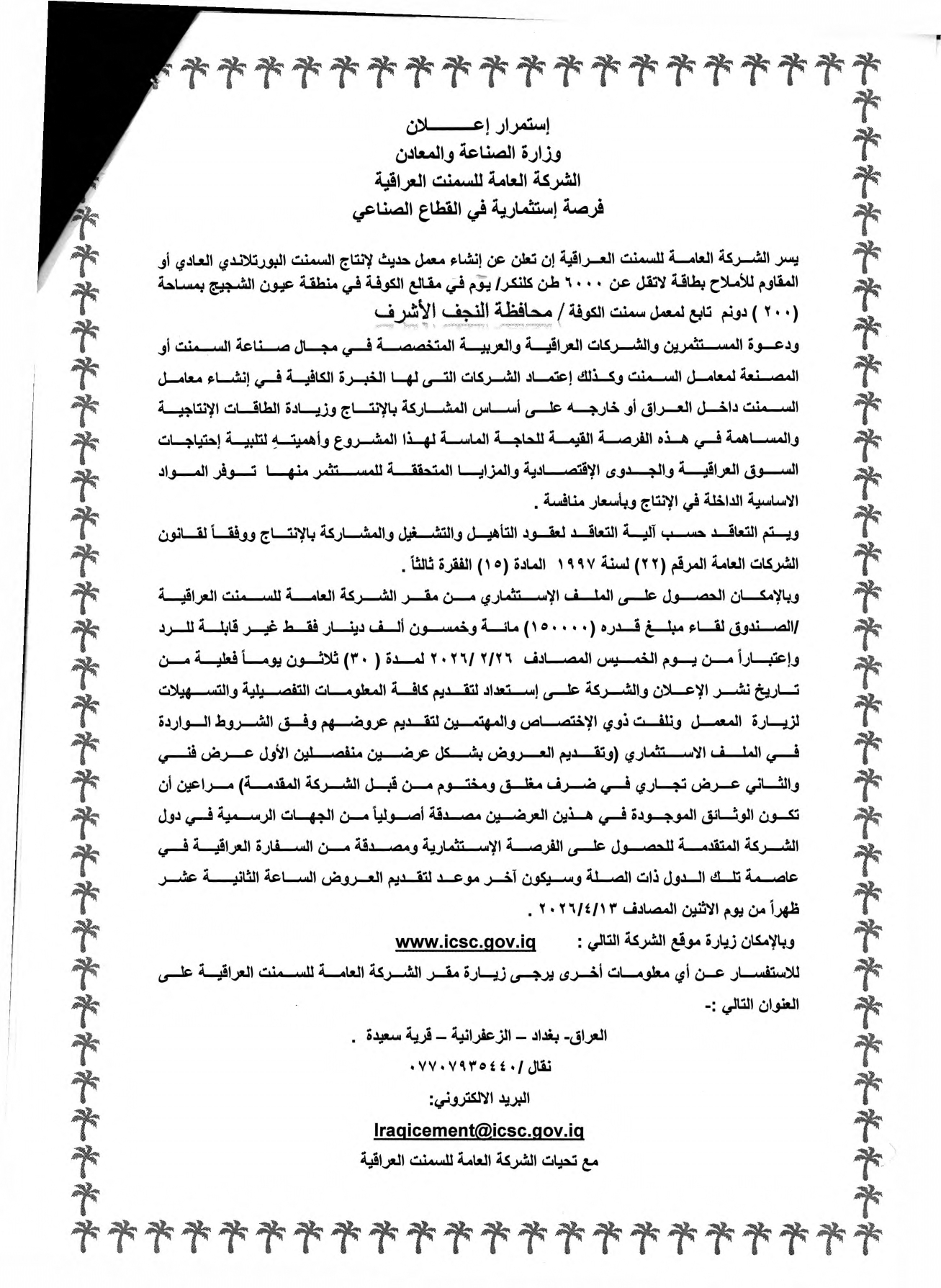 أعلان فرصة استثمارية في القطاع الصناعي يسر الشركة العامة للسمنت العراقية ان تعلن عن انشاء معمل حديث...