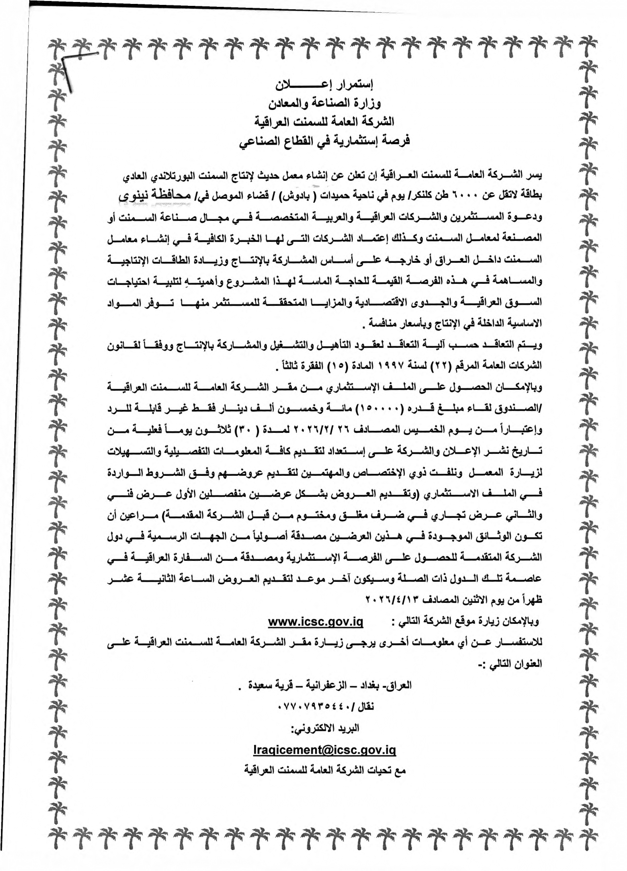 اعلان فرصة استثمارية يسر الشركة العامة للسمنت العراقية ان تعلن عن انشاء معمل حديث لانتاج السمنت البو...