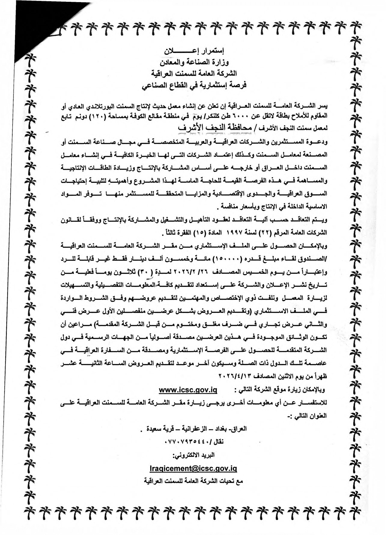 اعلان فرصة استثمارية يسر الشركة العامة للسمنت العراقية ان تعلن عن انشاء معمل حديث لانتاج البورتلاندي العادي او المقاوم للاملاح بطاقة انتاجية لاتقل عن 6000 طن كلنكر/يوم في مقالع الكوفة في منطقة عيون الشجيج بمساحة (200) دونم تابع لمعمل سمنت الكوفة/ محافظة النجف الاشرف